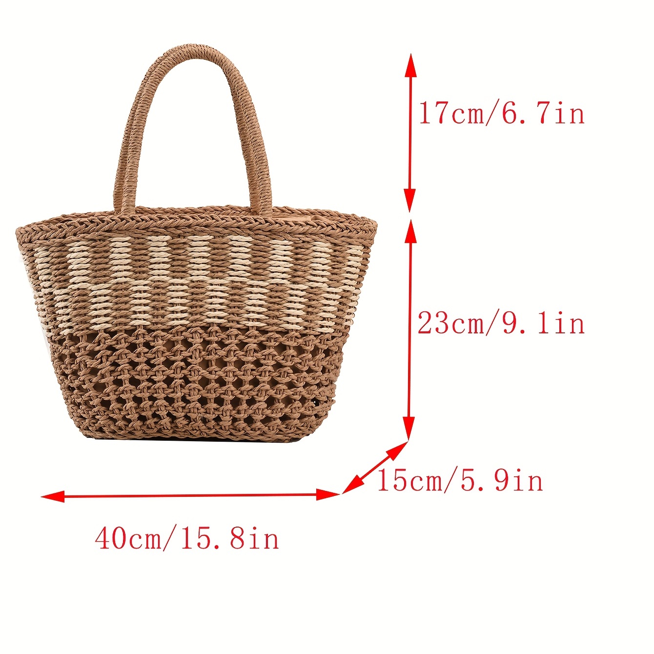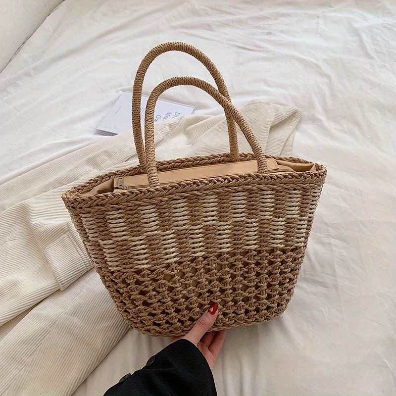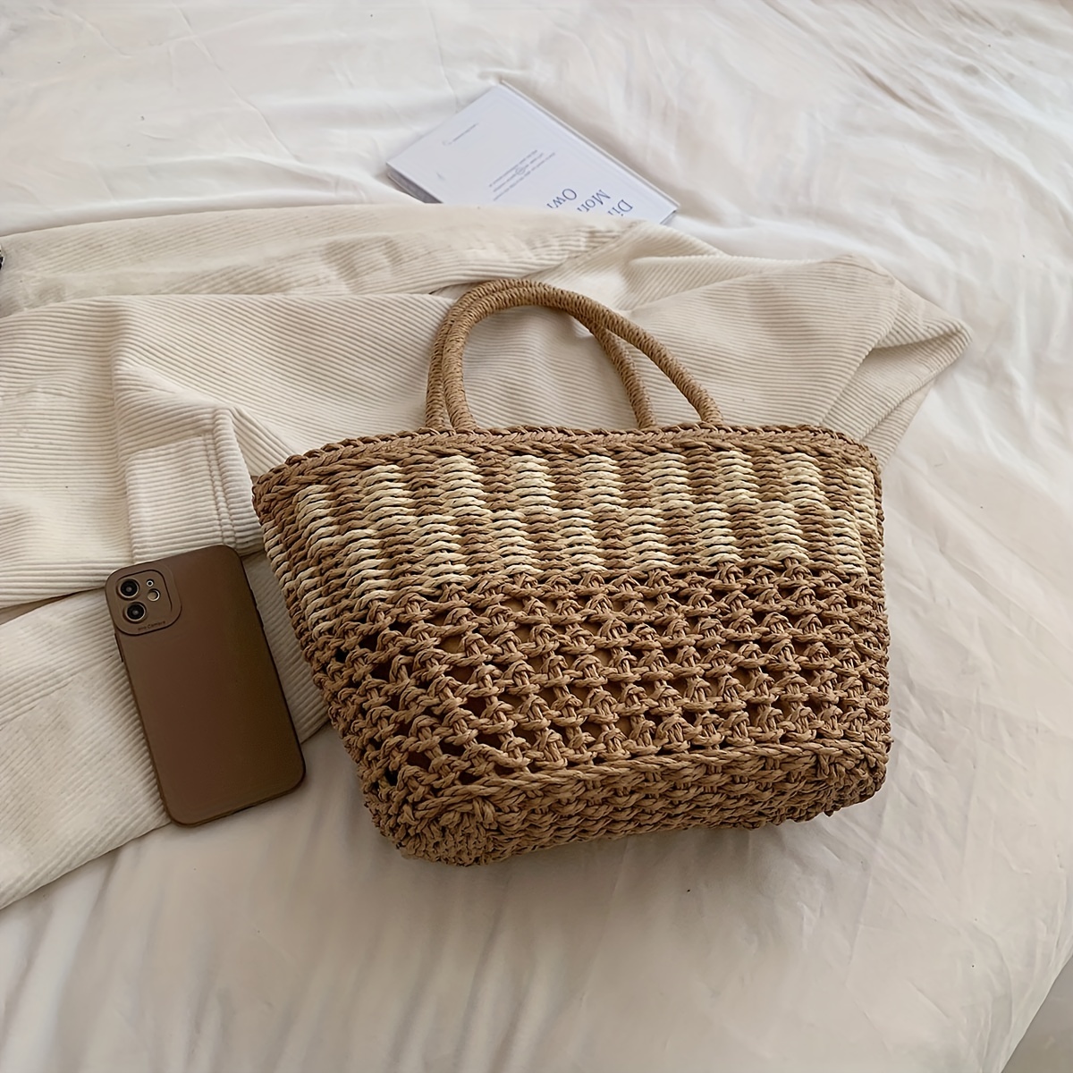 6% OFFColorblock Straw Tote Satchel Bag, Lightweight Simple Handbag, Versatile Travel Beach Bag