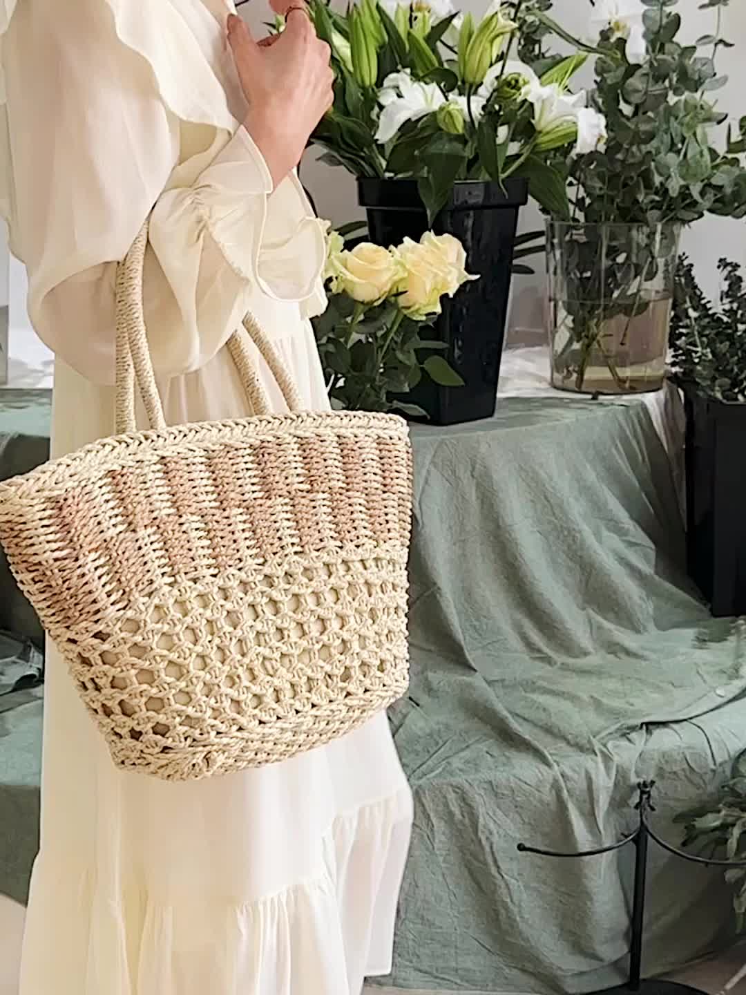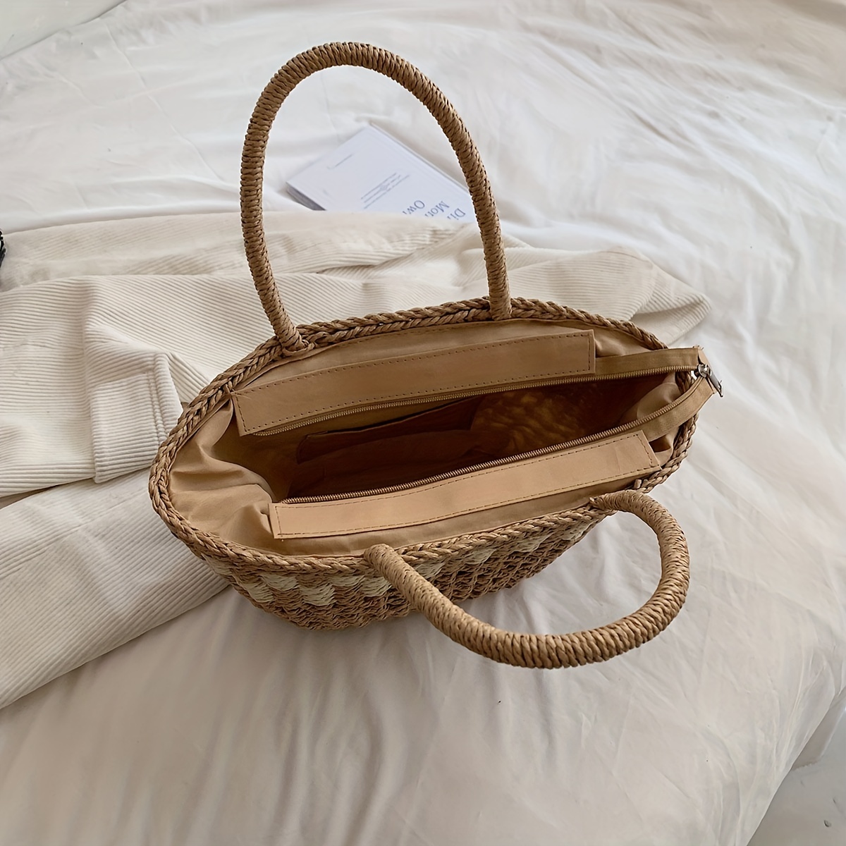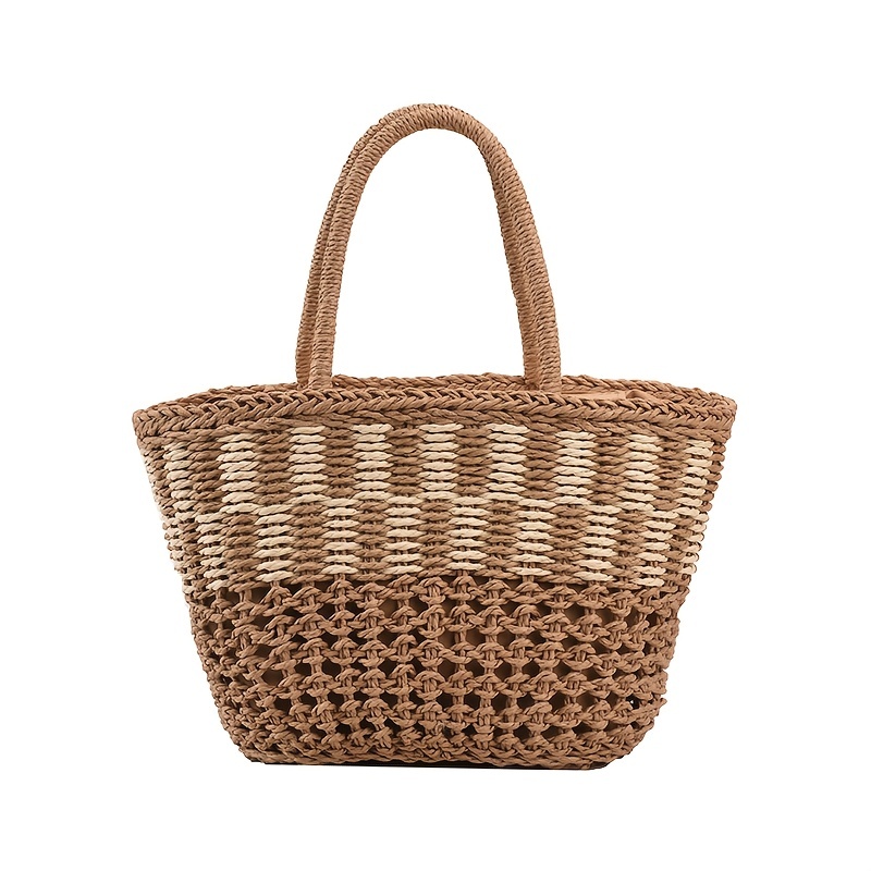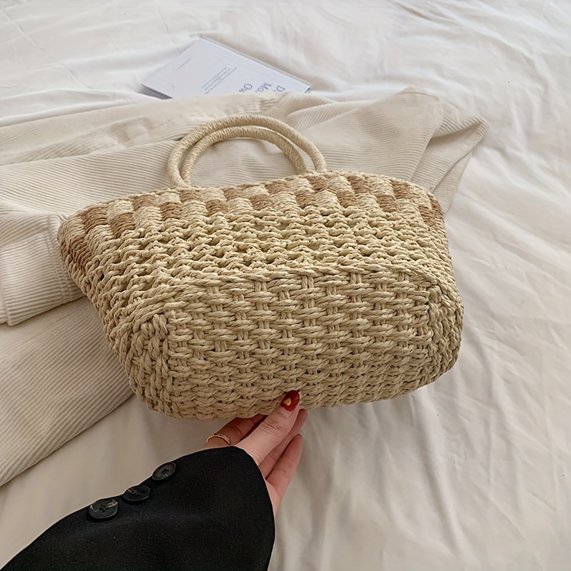 6% OFFColorblock Straw Tote Satchel Bag, Lightweight Simple Handbag, Versatile Travel Beach Bag