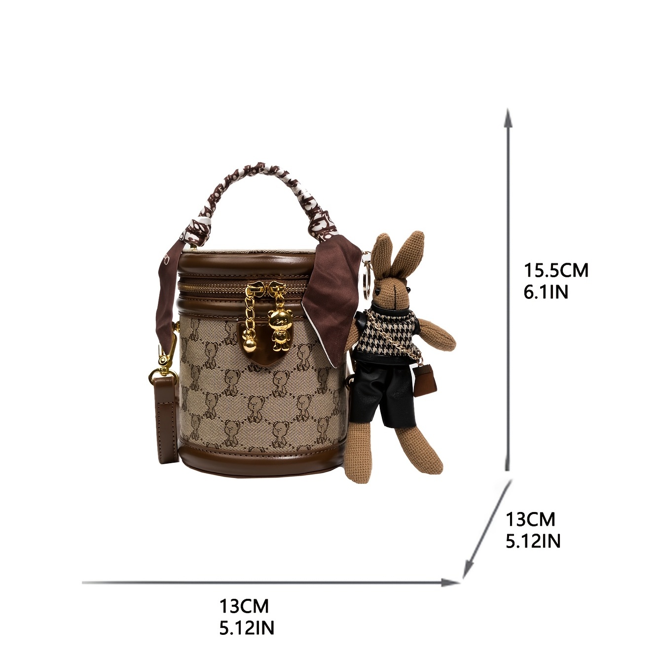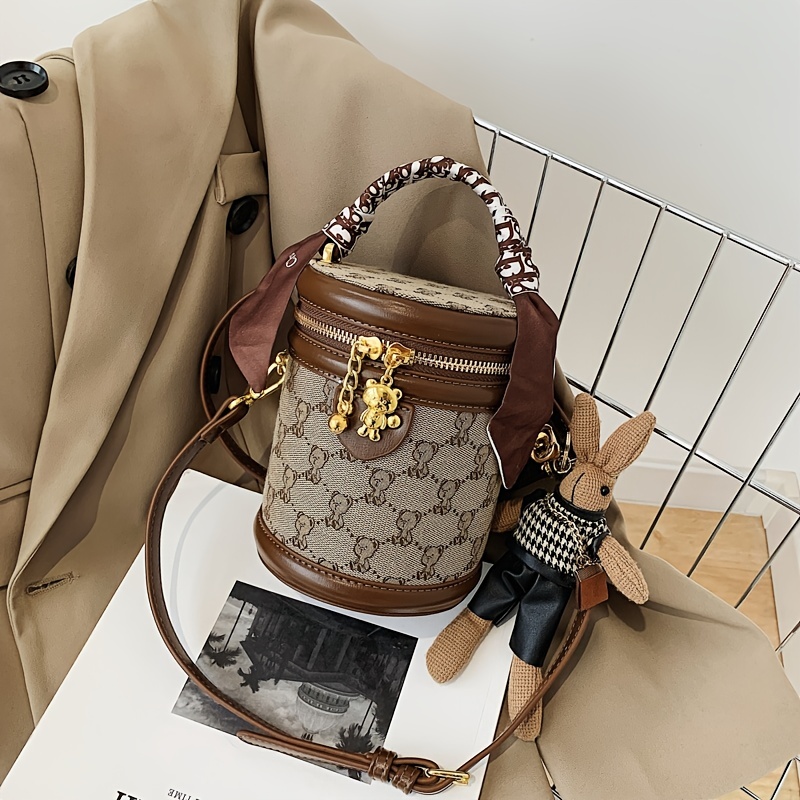 27% OFFBear Pattern Cylinder Bucket Bag, Small Scarf Decor Zipper Shoulder Purse, Trendy Crossbody Bag With Bag Charm